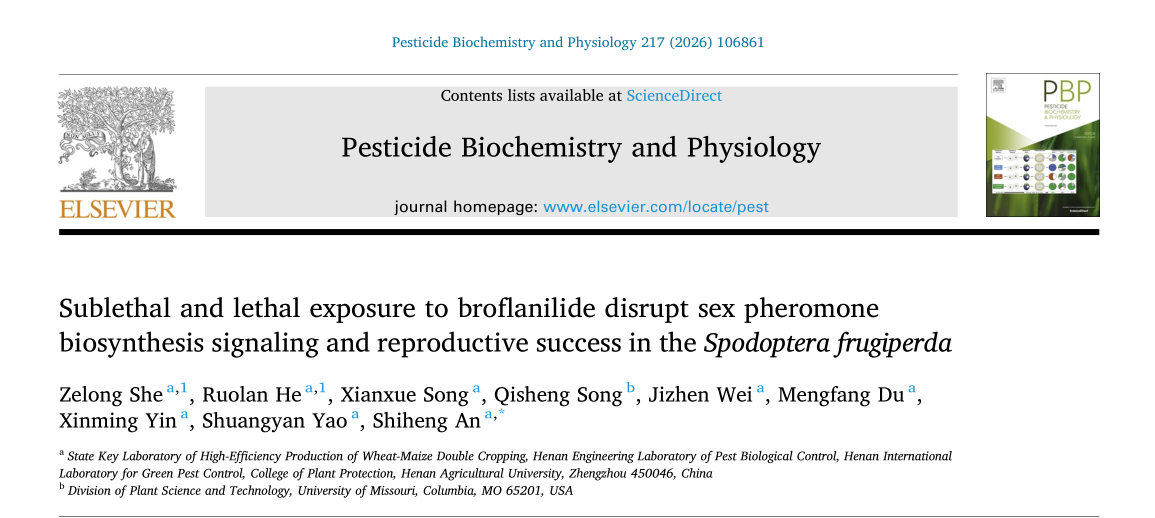 安世恒教授团队在《Pesticide Biochemistry and Physiology》发表了题为“Sublethal and lethal exposure to brofanilide disrupt sex pheromone biosynthesis signaling and reproductive success in the Spodoptera frugiperda”的研究论文。该研究表明,溴虫氟苯双酰胺在亚致死和致死剂量下均会显著干扰草地贪夜蛾的性信息素合成信号通路,影响其繁殖成功率,为害虫管理提供了新的见解。