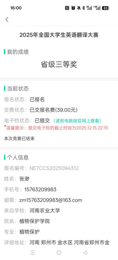 尚奕琳、王冰冰荣获国家励志奖学金;大二上学期专业综合成绩:尚奕琳第 4 名、王冰冰第 10 名、魏紫艳第 67 名。尚奕琳、孙浩然、杨少涵、魏紫艳参与 2026 年院级 “挑战杯” 大赛;尚奕琳、徐帆通过计算机二级考试;宿舍全员通过大学英语四级。尚奕琳荣获 “用英语讲中国故事” 大会省级三等奖;成员积极参与学院辩论赛,入围 “明思论道” 辩论赛决赛;魏紫艳获第五十四届校运会 4×100 米接力第 7 名;杨少涵作品入选 2025 年上半年青年宣传优秀作品,获评 “共青团宣传工作优秀作品”。